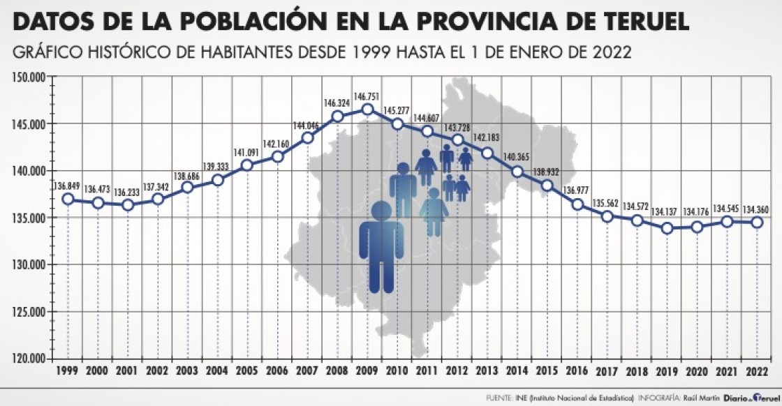 De esta manera, Aragón comenzó 2022 con 1.325.342 habitantes, 919 menos que un año antes. Las 134.360 personas que residen en la provincia de Teruel suponen poco más del 10% del total de la población aragonesa, según el INE.