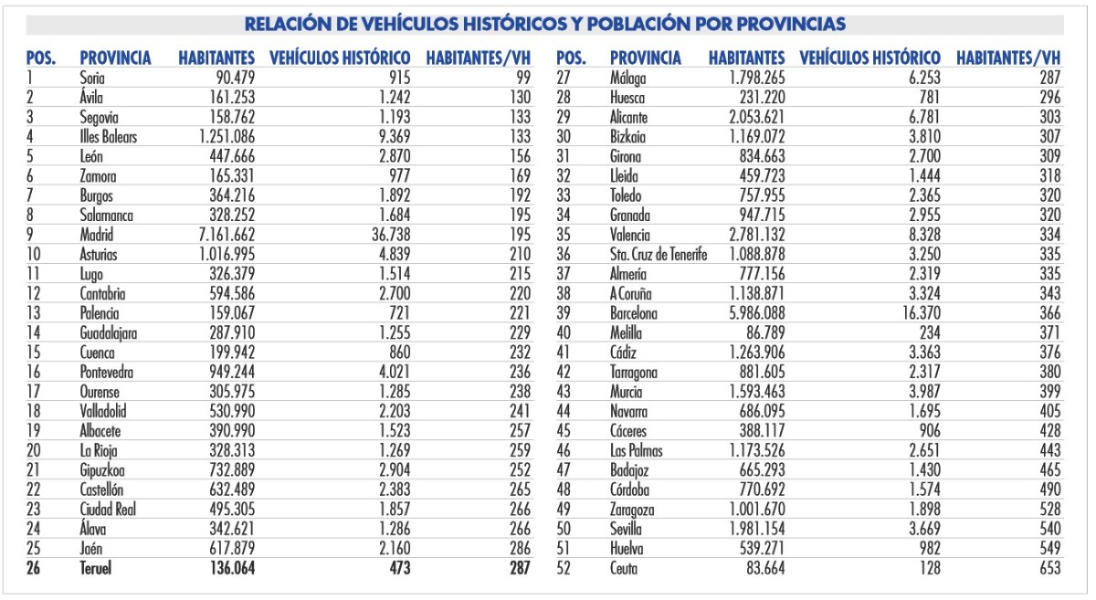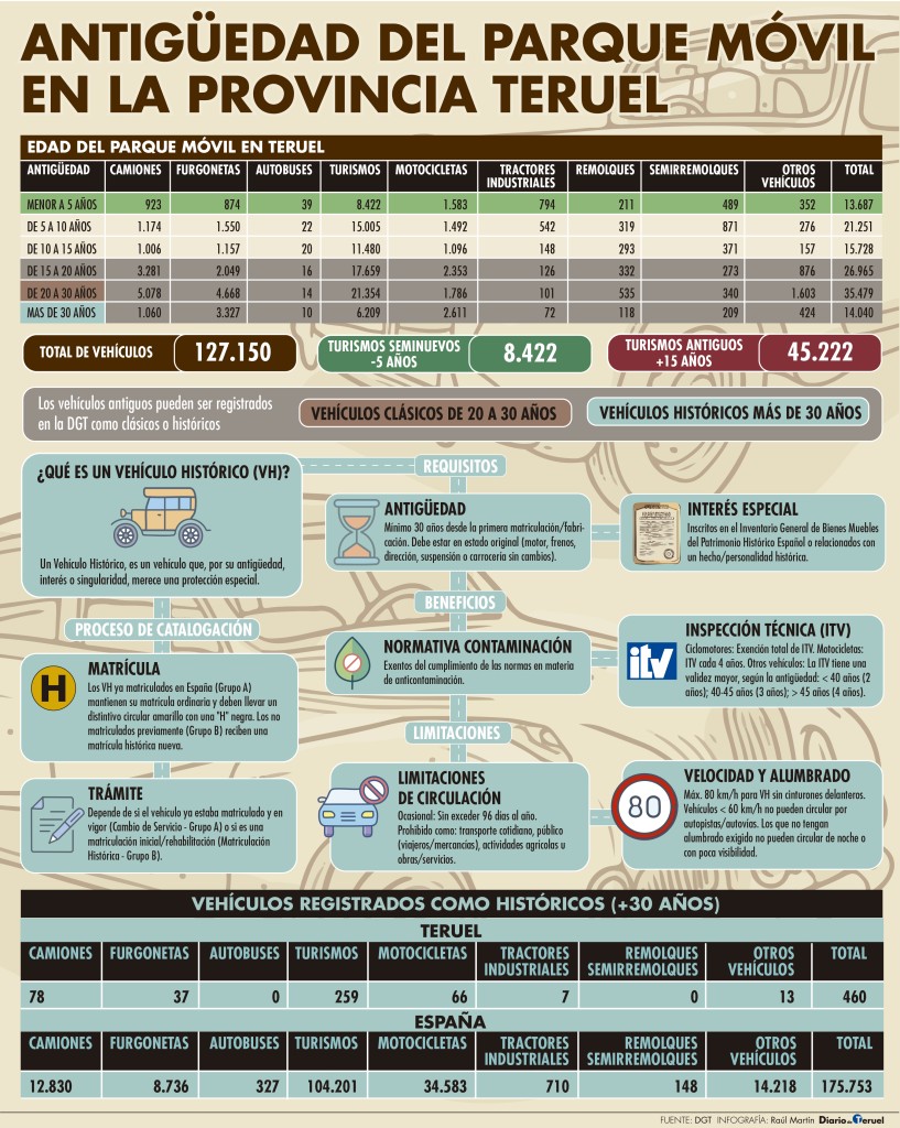 La provincia de Teruel agrupa a 460 de los 3.152 vehículos catalogados como históricos en la comunidad autónoma. Los turismos son, sin duda los más numerosos y con 259 suponen más de la mitad de estos vehículos. Los camiones, con 78 unidades, y las motos, con 66, le siguen en el ranking en el que se encuentran también furgonetas (38), tractores industriales (7) y vehículos de otro tipo (13). El censo de 460 vehículos históricos de la provincia la sitúa como la tercera con menor cantidad de España, superando solamente a las ciudades autónomas de Ceuta y Melilla.