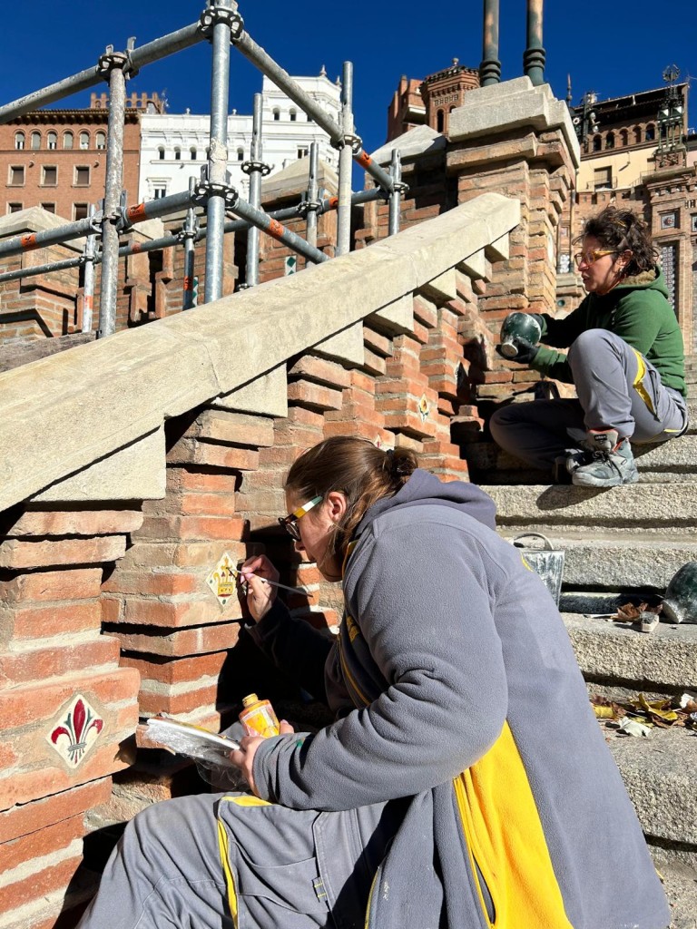 El director gerente de la Fundación Santa María de Albarracín, Antonio Jiménez, recuerda que esta intervención es posible gracias al patrocinio de la Fundación Térvalis, que es patrono de la Fundación Santa María de Albarracín con la que el Ayuntamiento de Teruel suscribió un convenio para intervenir en el patrimonio de la ciudad. Primero se recuperaron las fuentes de San Francisco y la Casa del Deán y ahora se está restaurando el monumento neomudéjar de la Escalinata en diferentes fases. En las primeras se actuó frente a la fachada del IES Vega del Turia y ahora se ha trabajado en el lado contrario, con un presupuesto en cada fase de 200.000 euros. Para posteriores fases, quedarían el lado más próximo al acceso al ascensor y su torreón, que se encuentra muy afectado por la humedad, y la plaza interior, donde se sitúa el relieve de los Amantes.