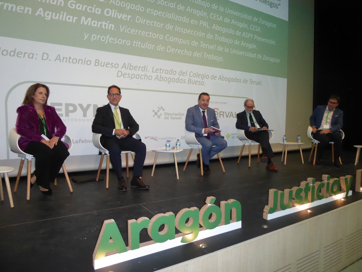 Entre las mesas redondas también tuvo un especial interés la centrada en la siniestralidad laboral y la prevención de riesgos. Moderada por el abogado Antonio Bueso, intervinieron el catedrático de Derecho del Trabajo de la Universidad de Zaragoza y presidente del Consejo Económico Social de Aragón, Juan García Blasco; el director de Inspección de Trabajo de Aragón, Román García Oliver; la vicerrectora del Campus de Teruel, Mari Carmen Aguilar; y el abogado especializado en prevención de riesgos, Andreu Sánchez.