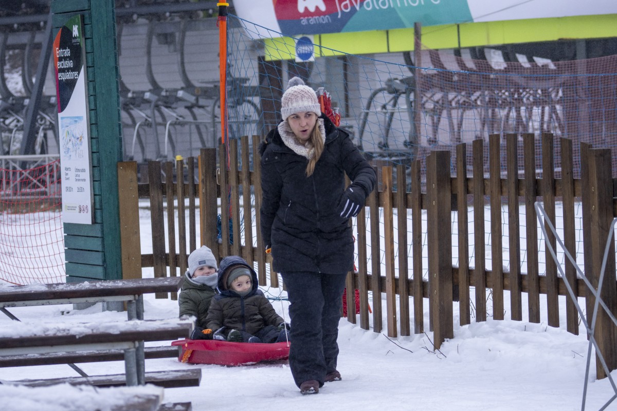De la localidad valenciana de La Eliana procedía, por ejemplo, Lourdes de Benito, que este sábado acudió junto a su marido a Javalambre para que sus dos niños pequeños disfrutasen con los trineos. Ambos son esquiadores y quieren “arrastrar” a sus hijos al deporte blanco, aunque este domingo iban a cambiar las pistas de esquí por el parque paleontológico Dinópolis ubicado en Teruel, donde se alojan.