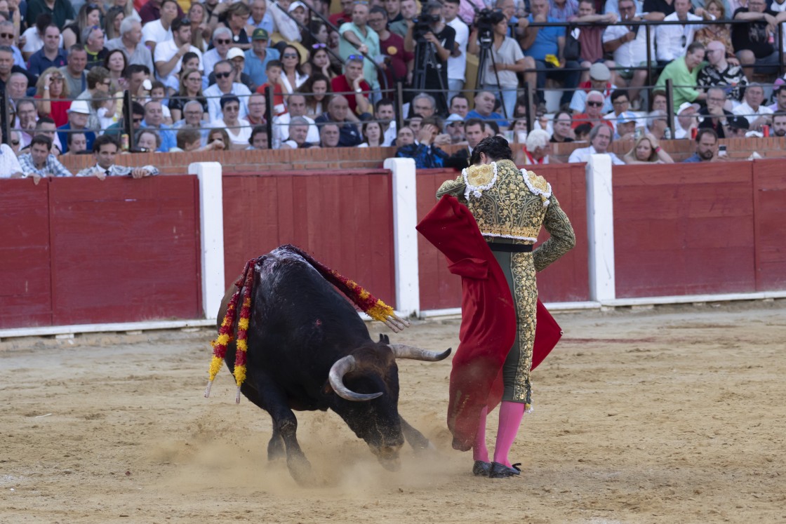 picador por enganchar al Algarra pisando el tercio. Tras el puyazo, que es duro, se denota la falta de fuerza del animal, que pierde todo su recorrido, dificultando la suerte a los banderilleros, que ejecutan un buen tercio poniendo todo de su parte. Se hace el silencio en Teruel cuando Juan Ortega coge la muleta, con una plaza expectante de triunfo. el torero, que desciende de Checa, trata de mecer, doblándose con él, la embestida de un animal sin fuerza, fundamentando su faena en muletazos sueltos pero templados, dándole al de Algarra el tiempo que necesita. El toro, que agarra sentido por momentos, cada vez recompone su embestida más rápido, defendiéndose más que embistiendo. Trasteo por lo bajo del torero sevillano, para aligerar una faena en la que no ha habido movilidad, ni transmisión ni materia prima. Estocada en lo alto. Palmas