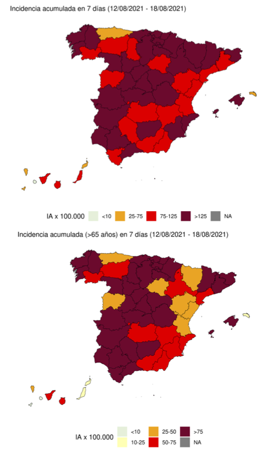 La provincia con menos contagios en este rango de edad es Asturias (35 casos por 100.000), seguida de Soria y Castellón (40 casos).