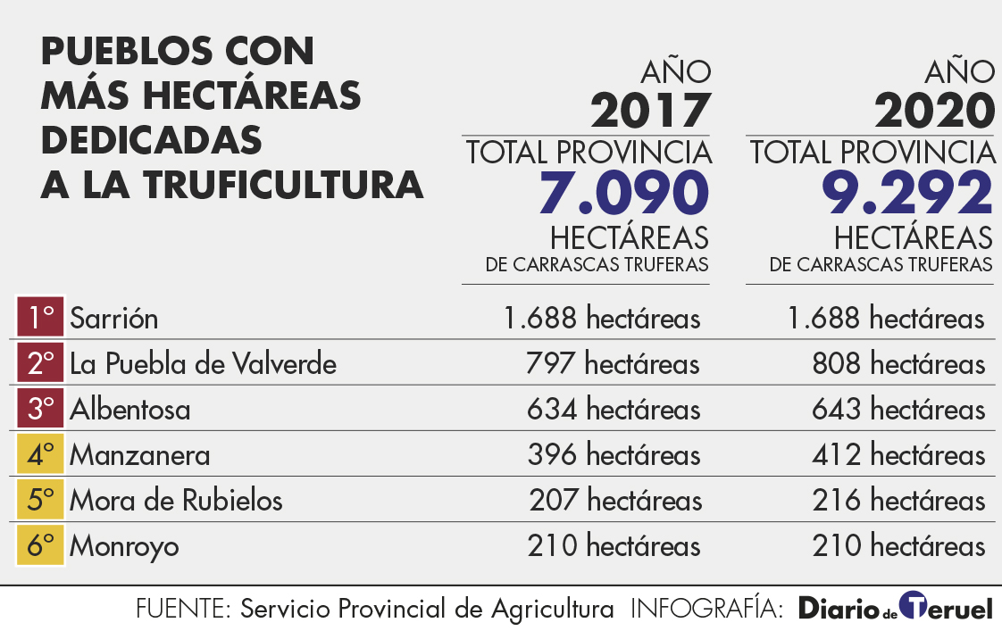 En el año 2020 había 9.292 hectáreas dedicadas a la trufa en la provincia de Teruel y distribuidas en 159 municipios. Los datos fueron facilitados por el Servicio Provincial de Agricultura y situaban 1.688 hectáreas en Sarrión, 808 en La Puebla de Valverde, 643 en Albentosa, seguida de lejos por Manzanera, con 412 hectáreas. En el año 2017, la información facilitada a DIARIO DE TERUEL por el Servicio Provincial de Agricultura era de 7.090 hectáreas, de las que Sarrión ya tenía 1.688 y había 797 en La Puebla de Valverde y 634 en Albentosa. En ese ejercicio se localizaban fincas truferas en 148 municipios de la provincia de Teruel.