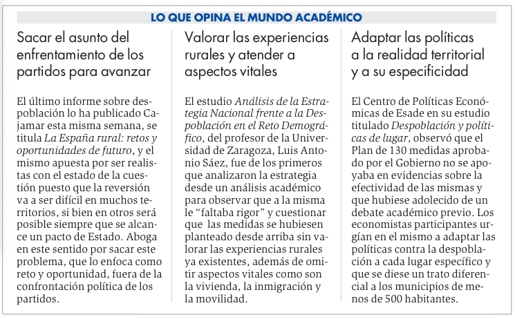 Son notables las observaciones que ha hecho el profesor de Economía Aplicada de la Universidad de Zaragoza, Luis Antonio Sáez, gran experto en la materia, que en el estudio Análisis de la Estrategia Nacional frente a la Despoblación en el Reto Demográfico en España, publicado en la revista Ager del Centro de Estudios sobre la Despoblación y Desarrollo de Áreas Rurales (CEDDAR), argumenta que hay “falta de rigor” en esta estrategia, entre otras cosas por plantearse desde arriba sin valorar las experiencias rurales.